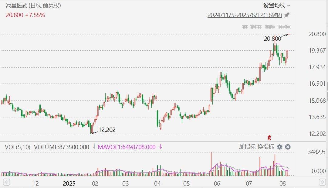 格隆汇8月12日|复星医药(600196)H股高开7.55%报20.8港元,创2023年5月以来新高;A股高开5.52%报28.28元。