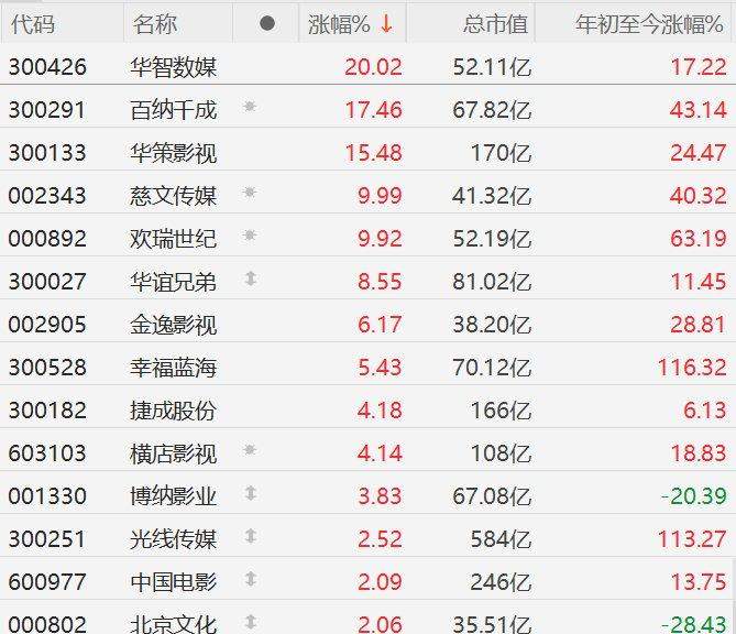 格隆汇8月18日|A股影视股集体走强,其中,华智数媒20CM涨停,百纳千成涨超17%,华策影视(300133)涨超15%,慈文传媒(002343)、欢瑞世纪(000892)10CM涨停,华谊兄弟(300027)涨超8%,金逸影视(002905)涨超6%,幸福蓝海(300528)涨超5%,横店影视(603103)涨超4%。