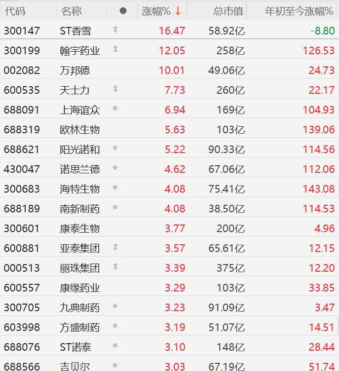 格隆汇8月18日|翰宇药业(300199)涨12%,万邦德(002082)10CM涨停,天士力(600535)涨超7%,上海谊众涨超6%,欧林生物、阳光诺和涨超5%,诺思兰德、海特生物(300683)、南新制药涨超4%。