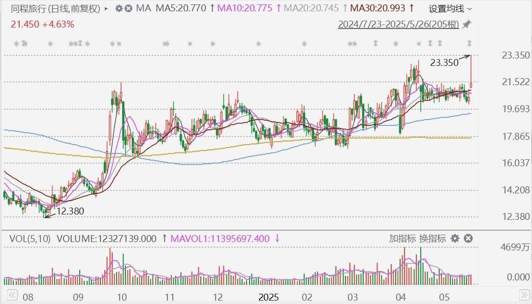 格隆汇5月26日|上周五盘后公布业绩的同程旅行(0780.HK)今日盘初一度涨近14%,报23.35港元,股价创历史新高。