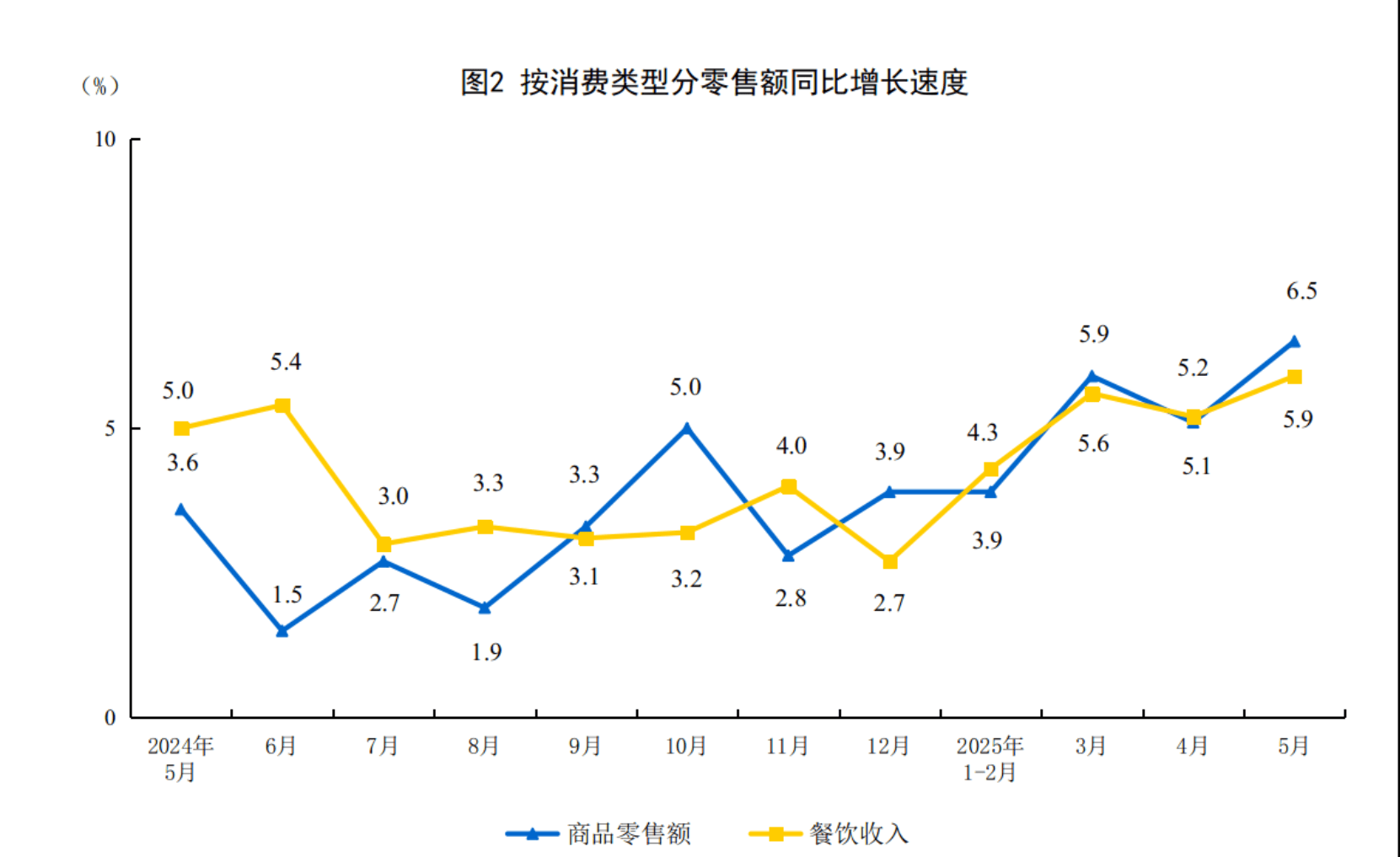 按消费类型分,5月份,商品零售额36748亿元,同比增长6.5%;餐饮收入4578亿元,增长5.9%。1—5月份,商品零售额180398亿元,增长5.1%;餐饮收入22773亿元,增长5.0%。