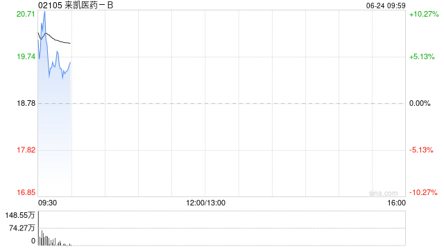 来凯医药-B(02105)早盘一度涨逾10%,截至发稿,股价上涨3.83%,现报19.50港元,成交额1.44亿港元。